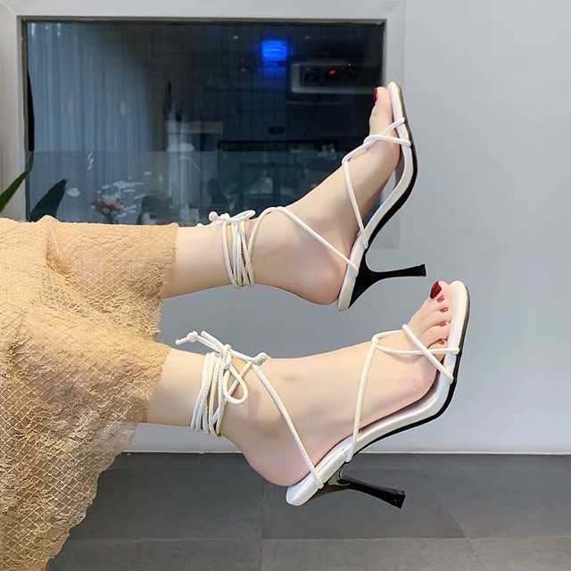 (Order) Dép guốc quai mảnh đan dây buộc cổ chân, gót nhọn 9cm free ship
